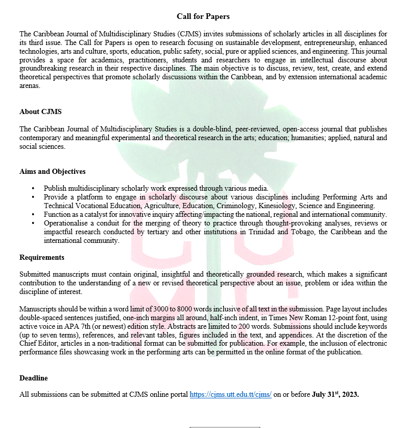 The Caribbean Journal of Multidisciplinary Studies (CJMS) invites submissions of scholarly articles in all disciplines for its third issue. The Call for Papers is open to research focusing on sustainable development, entrepreneurship, enhanced technologies, arts and culture, sports, education, public safety, social, pure or applied sciences, and engineering. This journal provides a space for academics, practitioners, students and researchers to engage in intellectual discourse about groundbreaking research in their respective disciplines. The main objective is to discuss, review, test, create, and extend theoretical perspectives that promote scholarly discussions within the Caribbean and by extension international academic arenas.